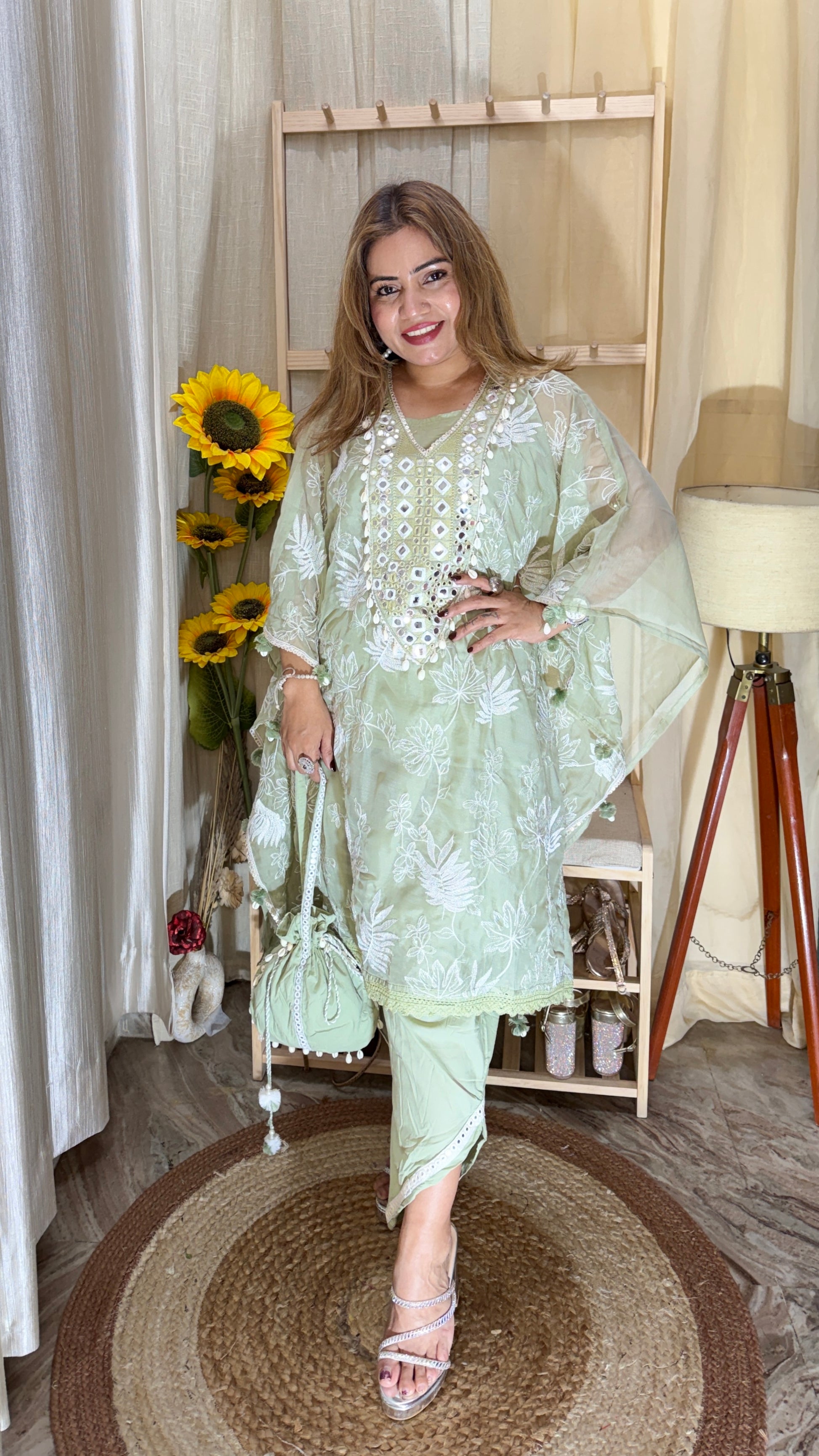 The soft pastel green tone combined with intricate embroidery and mirror detailing gives this outfit a luxurious yet subtle appeal. Ideal for festive celebrations, weddings, family gatherings, and special occasions, this co-ord set offers both comfort and timeless charm.