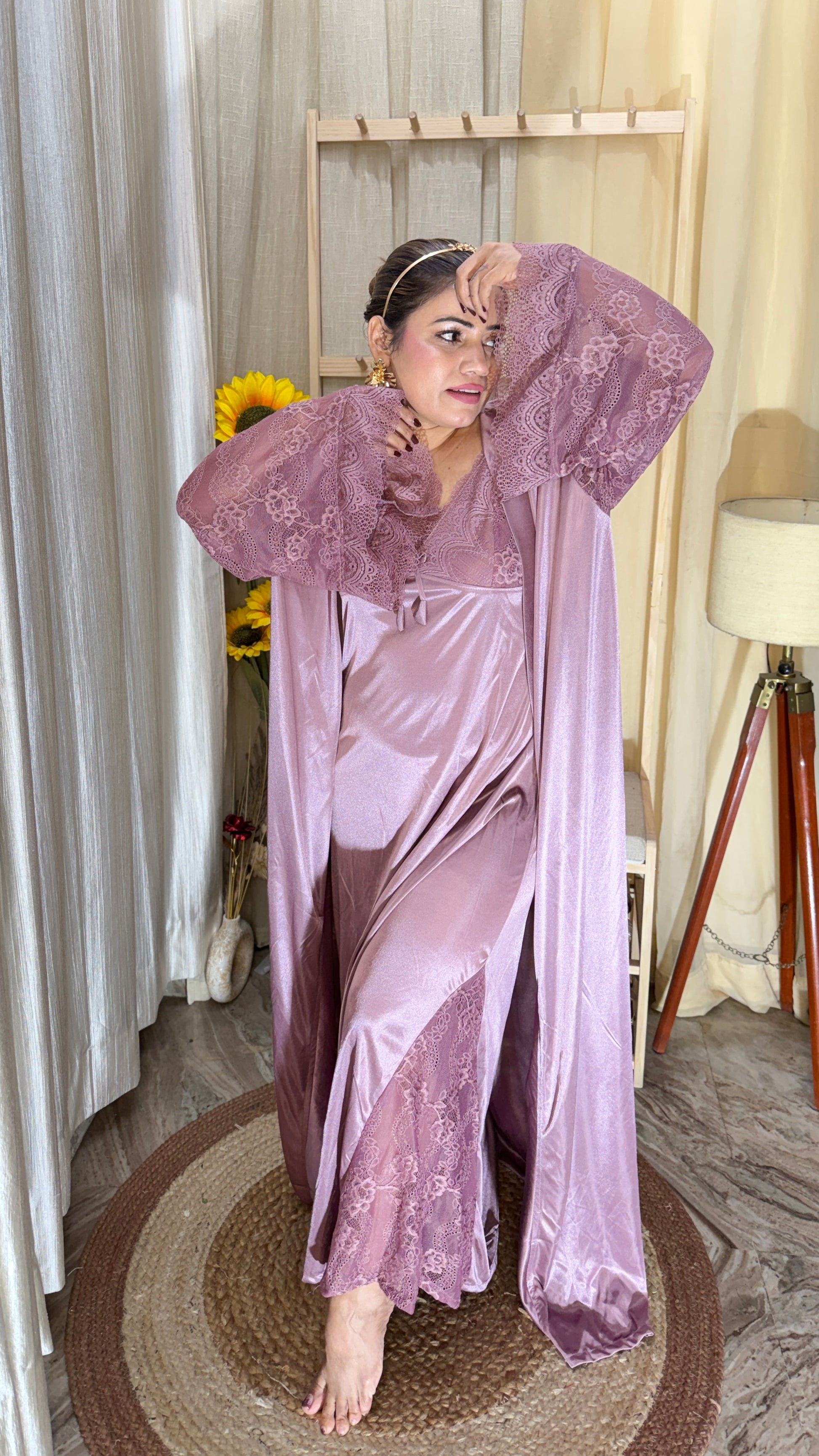 Dusty Rose Satin & Lace Nightwear Set with Robe – 3 Piece Luxe Sleepwear