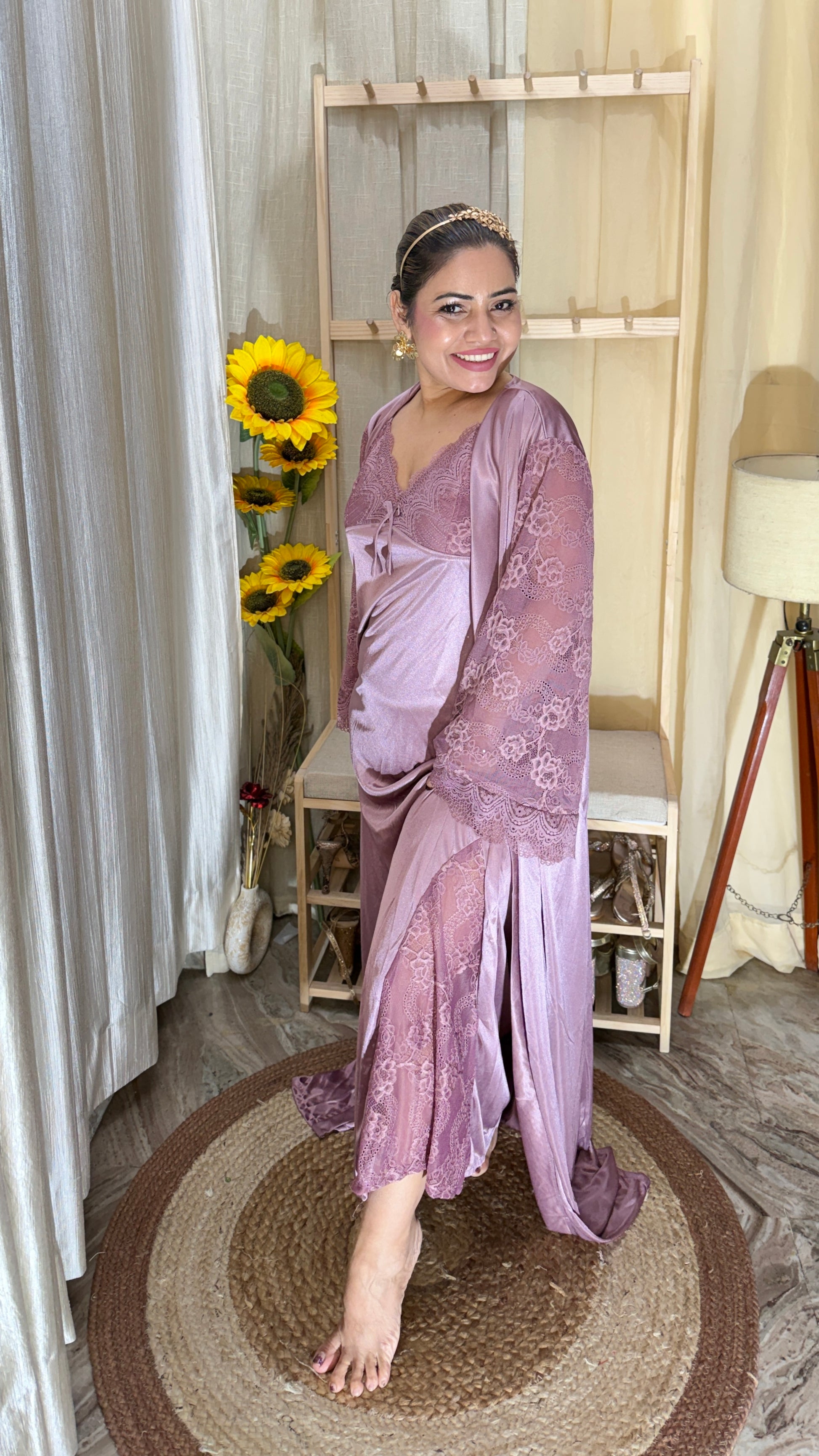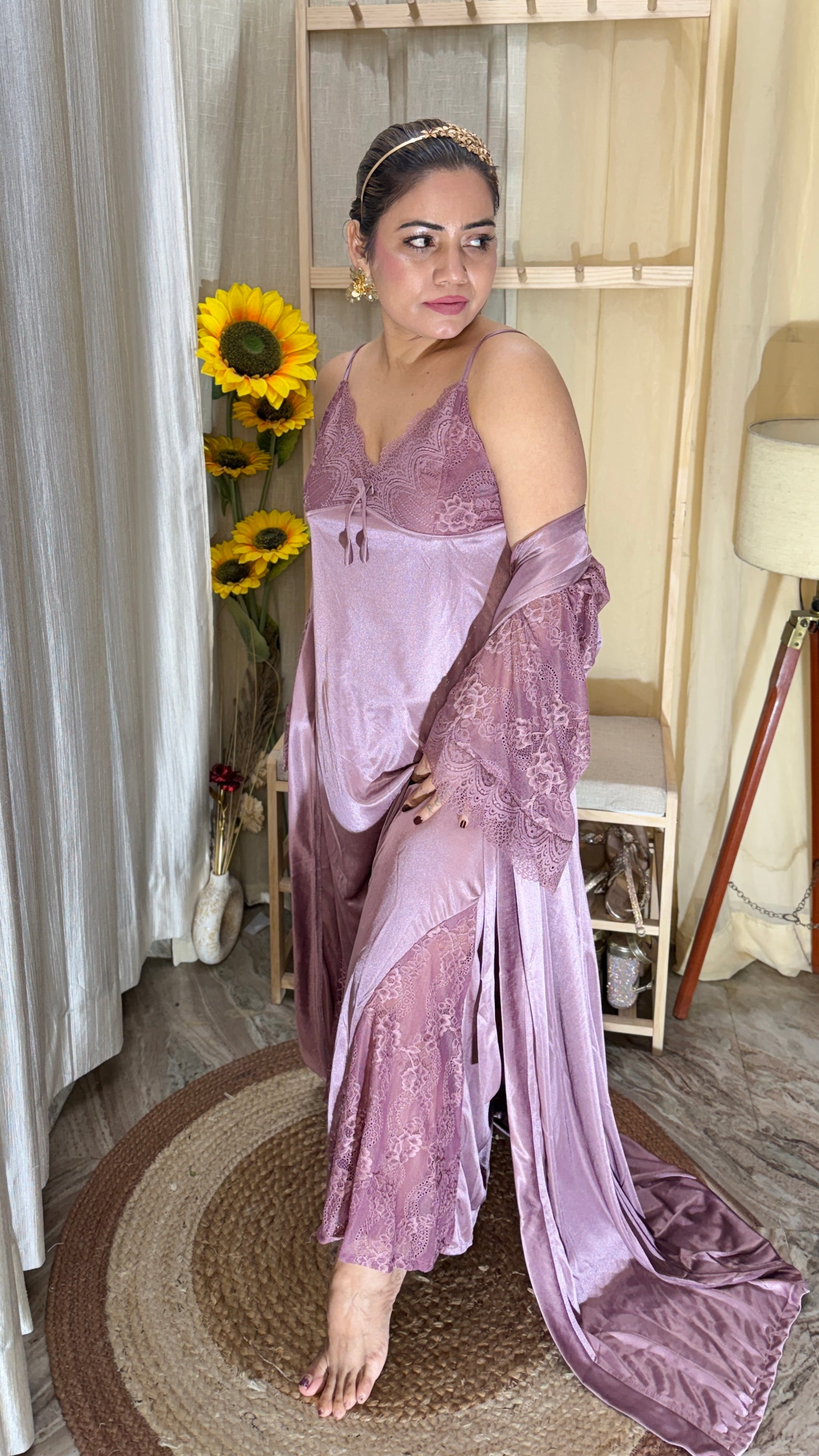 Indulge in effortless elegance with this Dusty Rose 3-piece nightwear set, designed for comfort with a touch of luxury. Crafted in a soft satin finish with delicate lace detailing, this set includes a lace-trimmed slip nightdress, matching palazzo-style bottoms, and a flowing lace robe. Perfect for nights in, special occasions, or bridal trousseau collections.